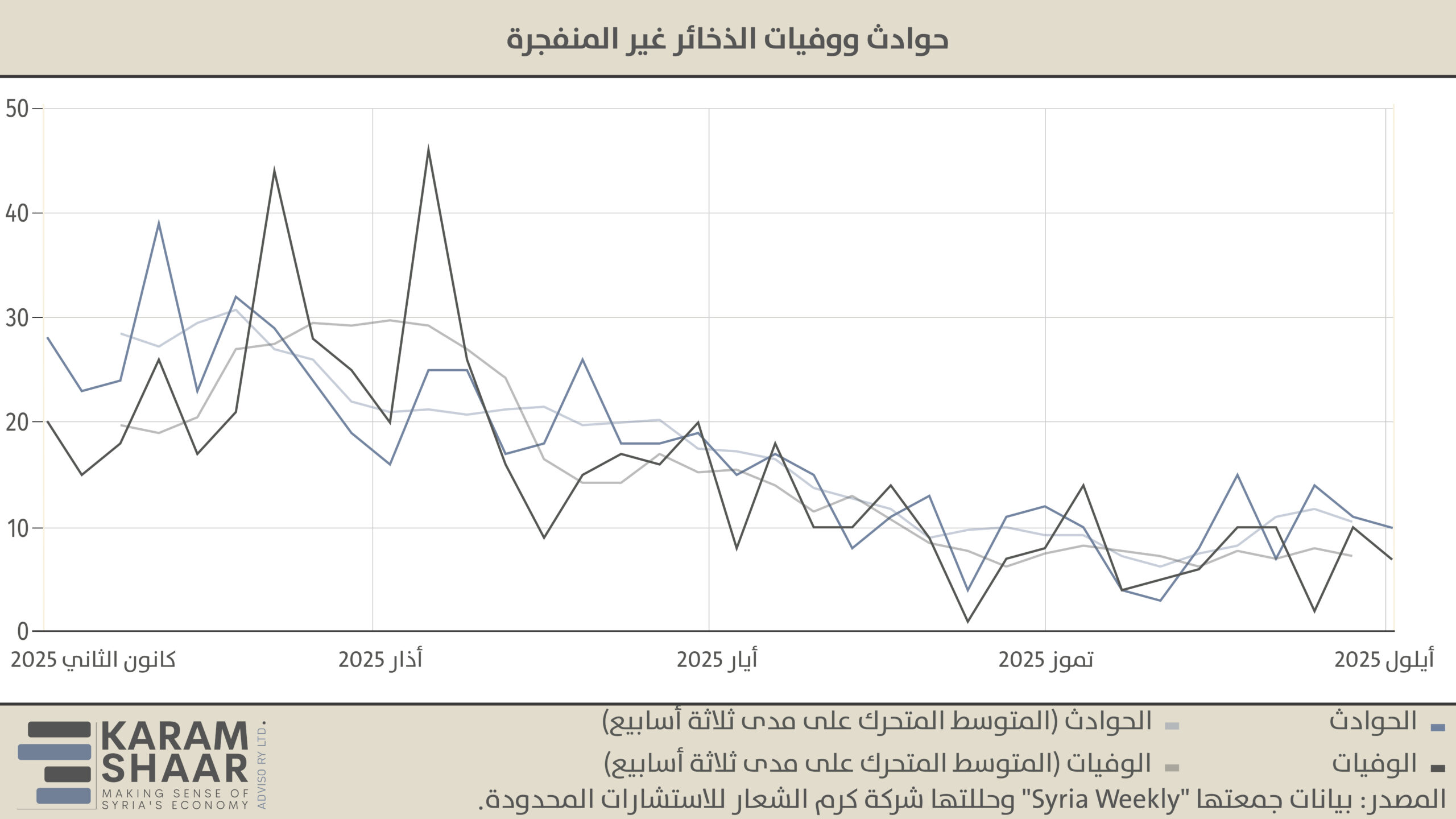 وفق بيانات جمعتها Syria Weekly وحللتها “سوريا بالأرقام”، شهدت البلاد نحو 650 حادثة انفجار أحد مخلفات الحرب غير المتفجرة في الأشهر التسعة الأولى من 2025، أسفرت عن أكثر من 570 وفاة ونحو 850 إصابة. ويُرجَّح أن تكون الحصيلة الحقيقية أعلى بسبب ضعف التوثيق المحلي والتحديات الهيكلية في الريف حيث تنتشر الحوادث بشكل أكبر.