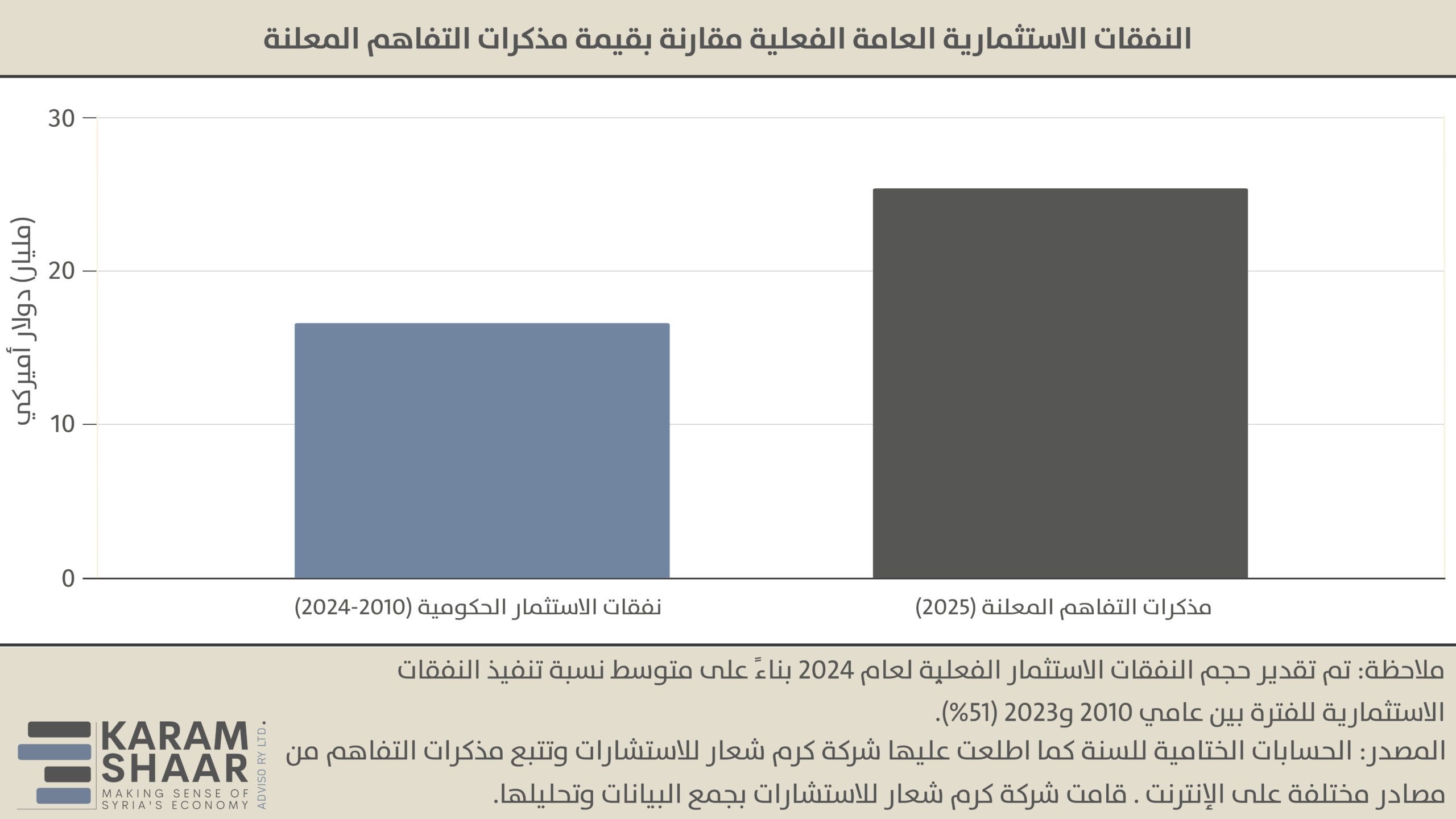 إلى جانب ذلك، فإن حجم الاستثمارات المعلنة تتجاوز بكثير القدرة الاقتصادية الكامنة لسوريا. و للمقارنة: بلغ مجموع الإنفاق الاستثماري الحكومي بين عامي 2010 و2024 نحو 16.6 مليار دولار فقط، أي أقل بكثير من قيمة المذكرات المعلنة (25.4 مليار دولار). أما الاستثمار الأجنبي المباشر (FDI)، فلا تتوفر بيانات عنه سوى لعامي 2010 و2011، ومن المرجح أنه كان هامشياً في السنوات اللاحقة نظراً للظروف الاقتصادية المتدهورة، وبالتالي فإن قيمته ضئيلة جداً مقارنة بما أُعلن حديثاً.