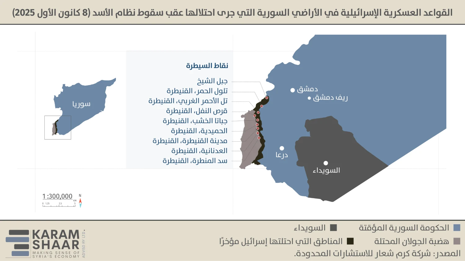 وشهد عام 2025، بعد ترسيخ السيطرة على هذه «المنطقة العازلة» الموسعة، تنفيذ القوات العسكرية الإسرائيلية مئات التوغلات البرية داخل سوريا، وفق بيانات جمعهتا Syria Weekly. كما أُنشئت وبُنيت تسع قواعد على الأقل لجيش الدفاع الإسرائيلي داخل الأراضي السورية المحتلة حديثًا (انظر الخريطة أدناه).