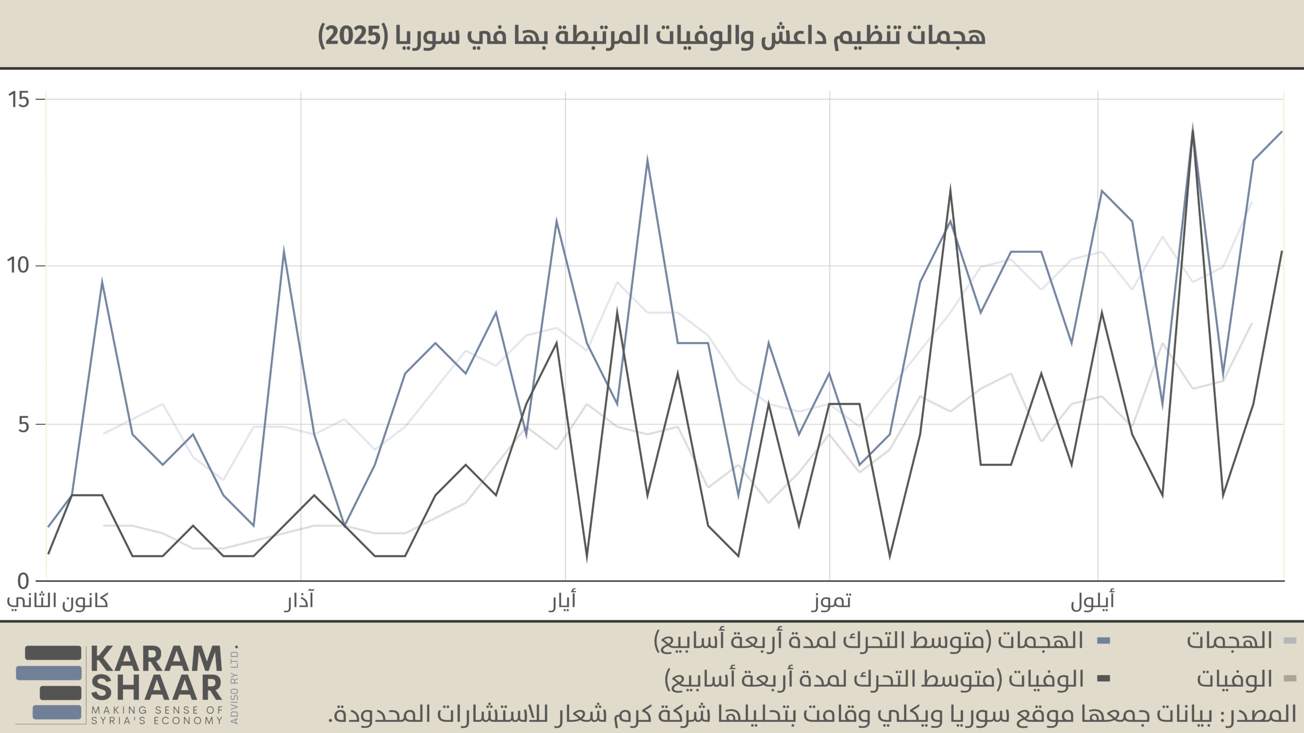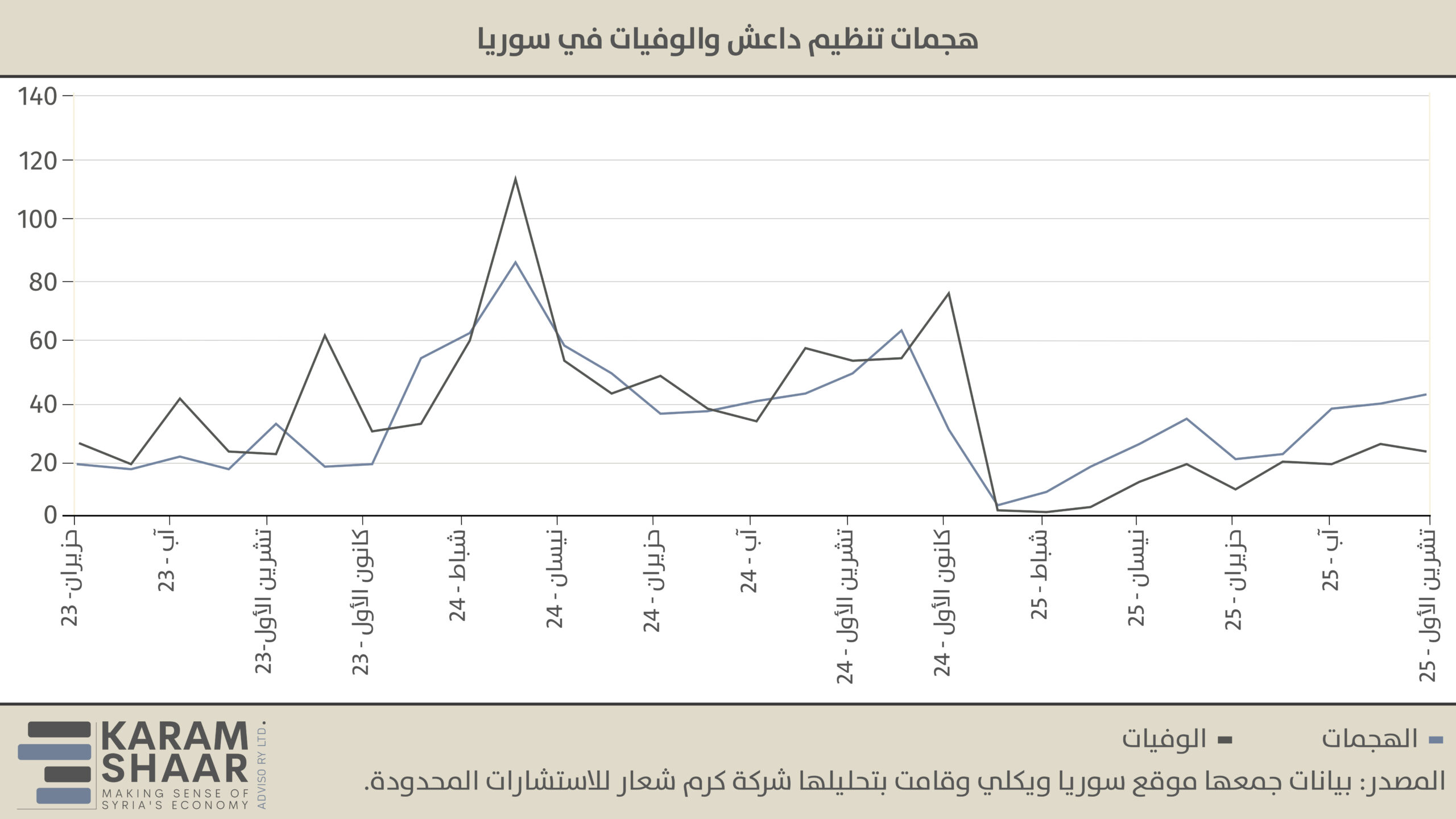 أما المؤشر الأخطر في عام 2025 فهو ارتفاع معدل فتك الهجمات في الأسابيع الأخيرة. فمنذ 1 كانون الثاني حتى 29 أيلول، أسفرت 78 هجمة عن سقوط قتيل واحد على الأقل. ومن بين هذه الهجمات، وقعت 35 (45%) بين كانون الثاني وتموز، فيما وقعت 43 (55%) بين 1 آب و20 تشرين الأول، وحدث 37% منها خلال الأسابيع الستة الأخيرة وحدها. وتشير هذه الأرقام إلى زيادة ملموسة وحديثة في قدرة التنظيم على تنفيذ هجمات قاتلة من حيث الأهداف والتسليح والاستخبارات والاستعداد لتحمّل الخسائر.