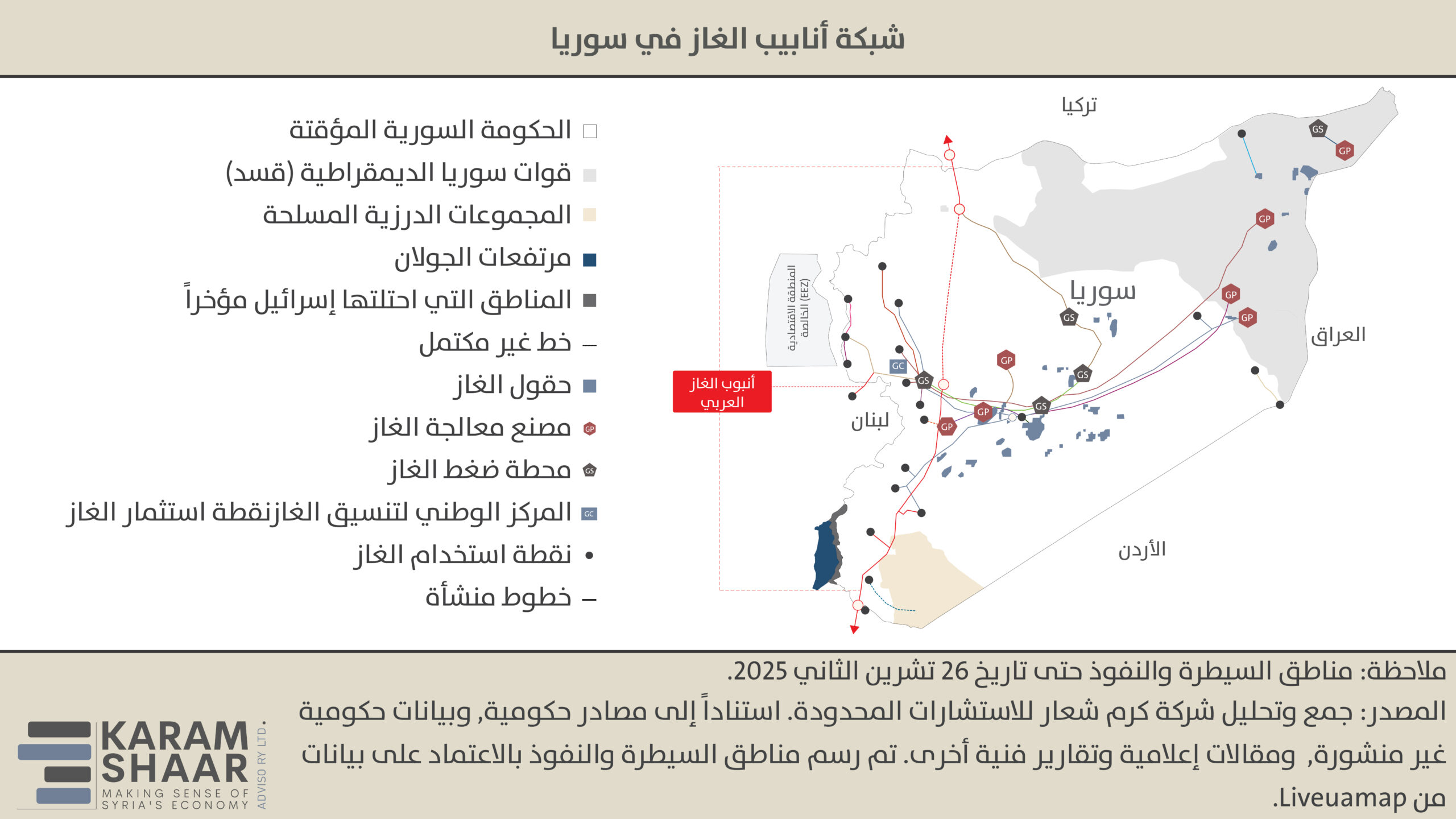 اليوم، يربط الخط سوريا بالشبكة الإقليمية، وإن كانت التدفقات تجري من الشمال إلى الجنوب بدلًا من العكس (من مصر لسوريا). وفي آب 2025، بدأت تركيا تزويد سوريا بالغاز الأذري عبر مقطع كلّس–حلب الجديد بطول 93 كيلومترًا، الذي يرتبط بـ “خط الغاز الطبيعي الجنوبي” التركي ثم بـ “خط الأناضول العابر للغاز” (TANAP). يضخ TANAP حاليًا نحو 3.4 ملايين متر مكعب يوميًا، مع خطط لزيادتها إلى 6 ملايين. وفي أواخر آب، وقّعت وزارة الطاقة السورية اتفاقًا إضافيًا مع شركة “نقّاش هولدينغ” التركية لتوريد 1.6 مليون متر مكعب يوميًا ضمن جهود الالتزام بالكميات المتفق عليها مع “سوكار” الأذرية و”بوتاش” التركية.