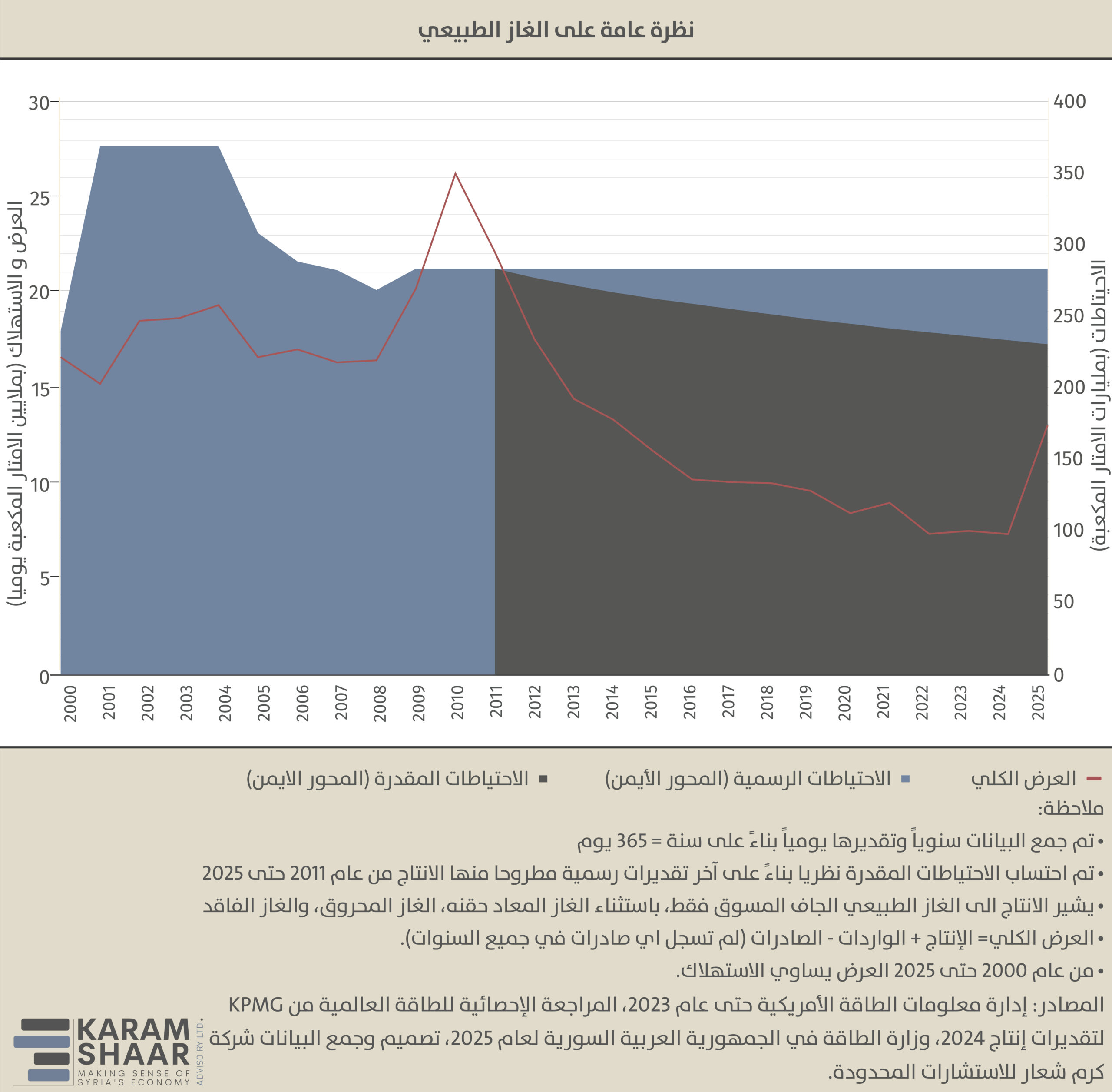 تتركز معظم احتياطيات الغاز الطبيعي في سوريا في المناطق الوسطى والشرقية. وقدّر آخر تقييم رسمي عام 2011 الاحتياطي بـ 285 مليار متر مكعب، إلا أن تقديراتنا تشير إلى أن الإنتاج منذ ذلك الوقت خفّض الاحتياطي البري المؤكد إلى نحو 231 مليار متر مكعب. وفي الفترة نفسها، قُدّر الاحتياطي البحري المحتمل بنحو 170 مليار متر مكعب، في حين أعلنت السلطات السابقة عن اكتشافين صغيرين على اليابسة: دير عطية عام 2019 باحتياطي 500 متر مكعب فقط، وزملة المهر عام 2022 من دون الإعلان عن حجم الاحتياطي.