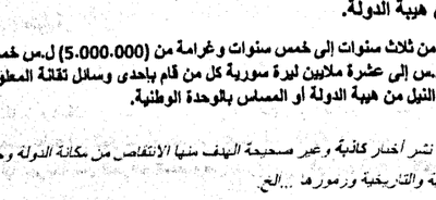 The infamous “undermining the prestige of the state” that most Syrians make fun of is punishable by 3–5 years in prison, according to Article 28. The law defines “Undermining the prestige of the state” as publishing false news and information with the aim of bringing down the status of the state and its components (including its idols).