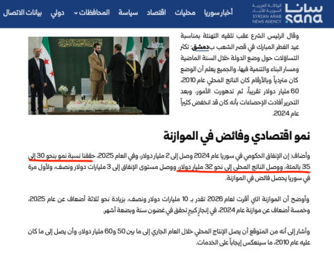 In March, the Syrian president claimed, citing the finance minister’s assessment, that Syria’s GDP grew by 30-35% in 2025, reaching $32 billion