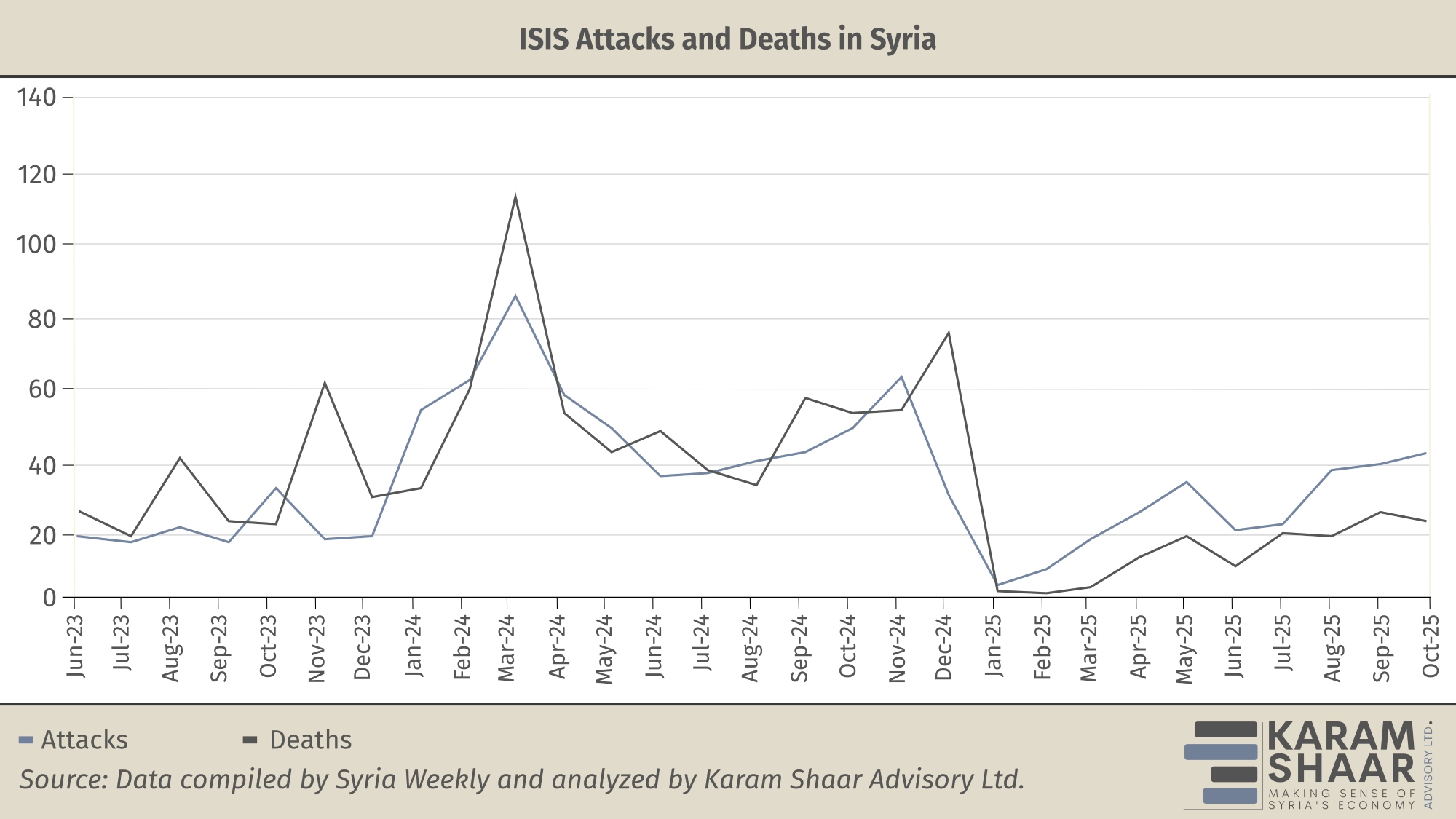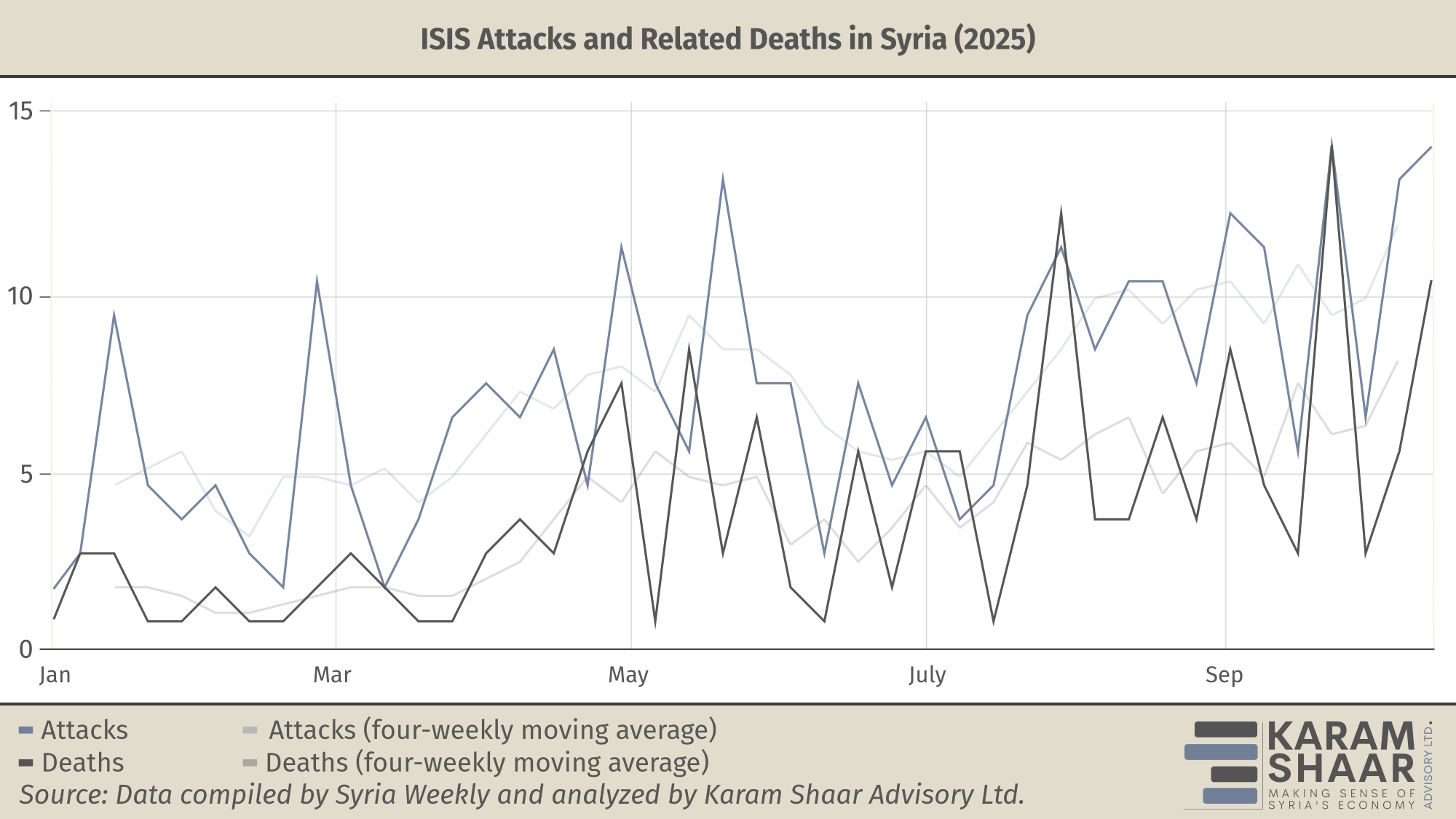 Consequently, between 1 January and 1 April 2025, ISIS’s operational tempo plummeted to an average of just ten attacks per month, while the deadliness of its operations fell to roughly one death per month—down from 63 in 2024. During this period of relative inactivity, ISIS appears to have regrouped; attacks and fatalities rose steadily through May, paused briefly, then increased again from July through September.