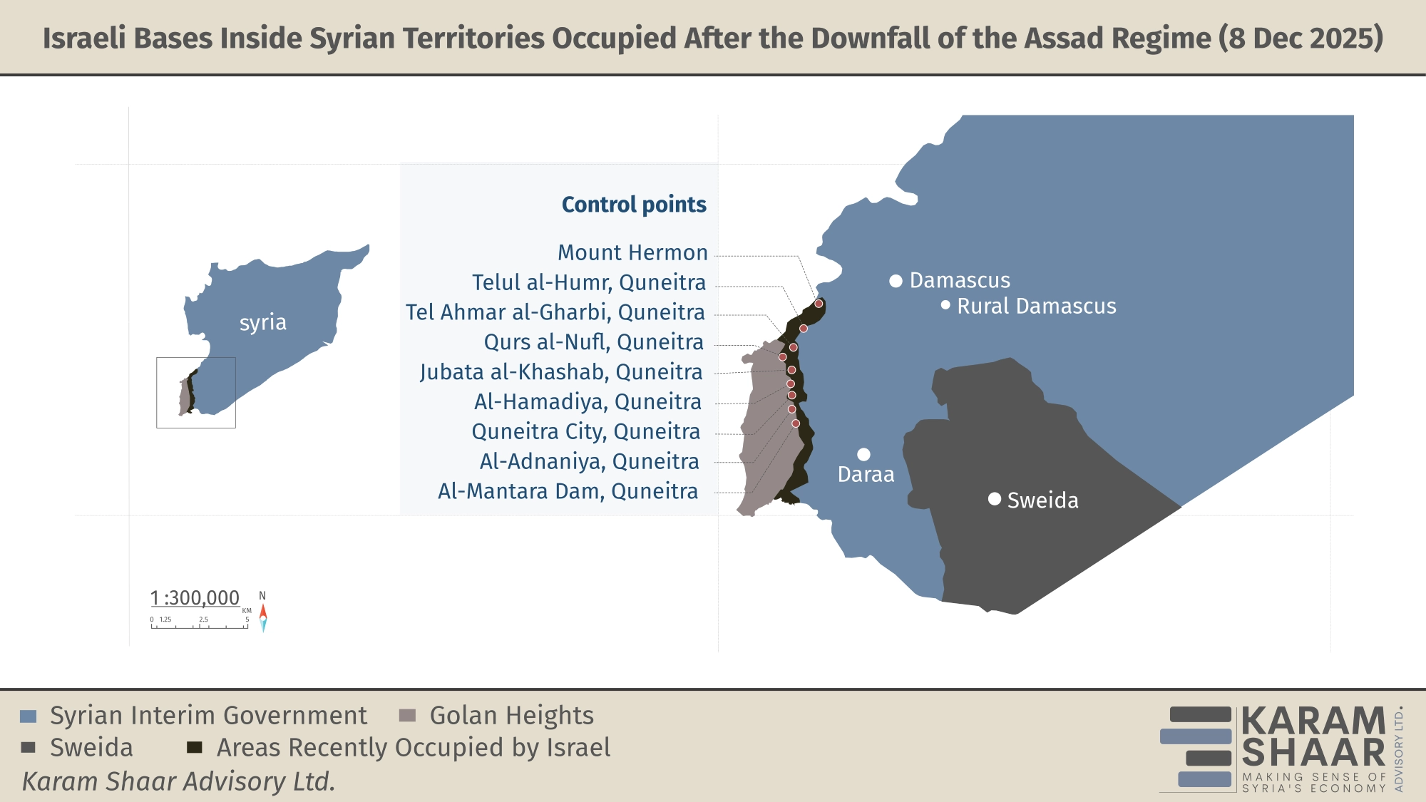 In 2025, having consolidated control over this expanded “buffer zone,” Israeli military forces launched hundreds of ground incursions into Syria, according to data collected by Syria Weekly. At least nine Israel Defense Forces (IDF) bases have also been established and constructed inside newly occupied Syrian territories (see map below).