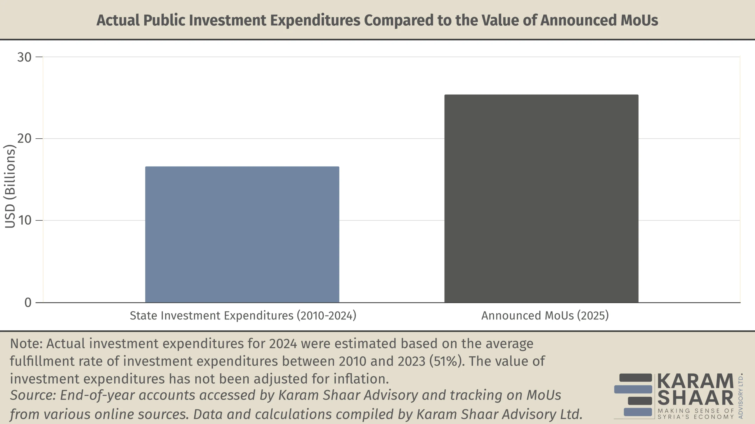 Finally, the scale of announced investments far exceeds Syria’s underlying economic capacity. To put the value of MoUs (USD 25.4 billion) into perspective, total government investment expenditures between 2010 and 2024 stood at USD 16.6 billion (see chart below). Foreign direct investment (FDI) figures for most of this period are unavailable, except for 2010 and 2011, but it is likely that FDI was minimal in subsequent years due to the deteriorated economic environment—and thus dwarfed by the value of recent announcements.
