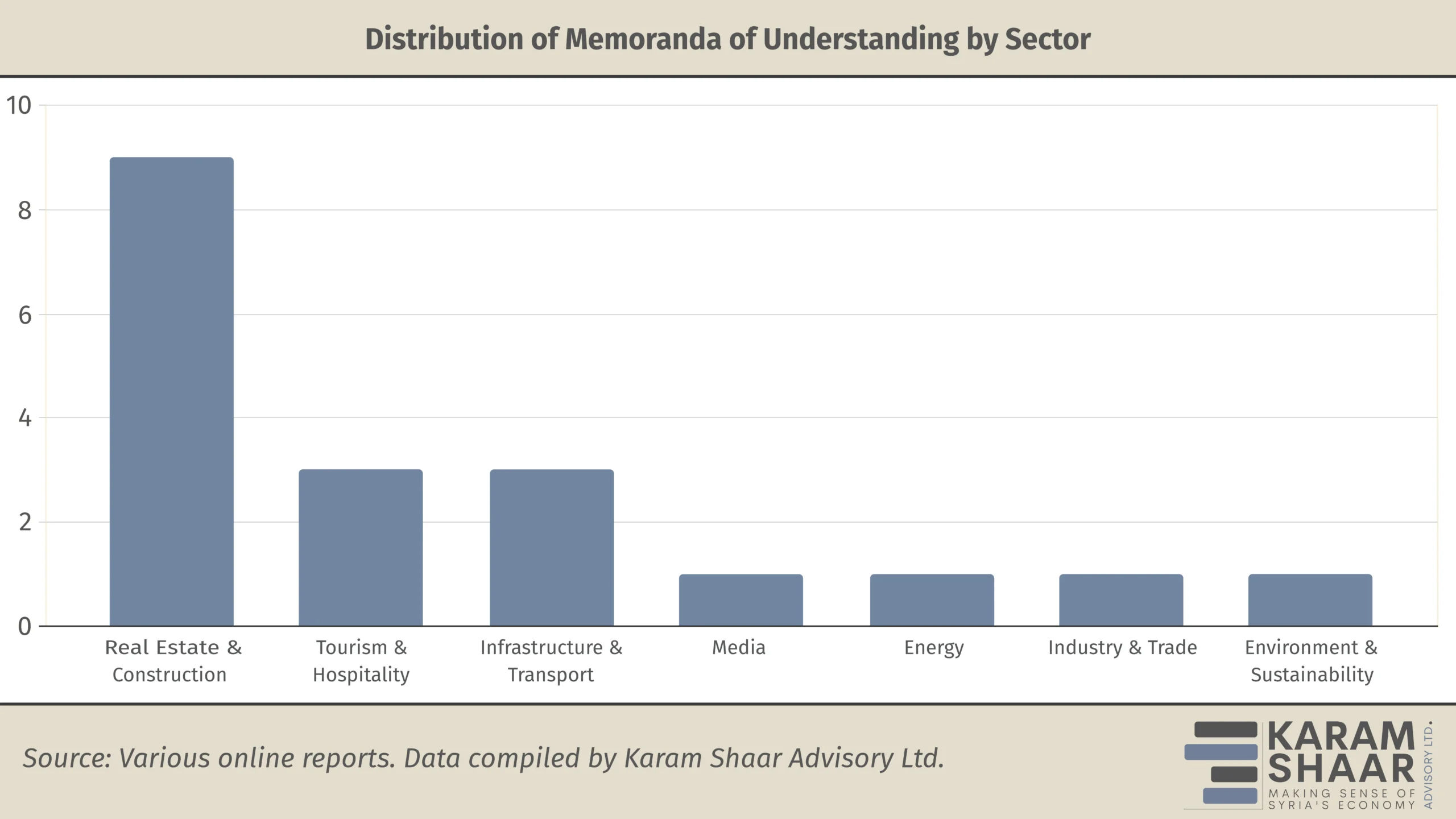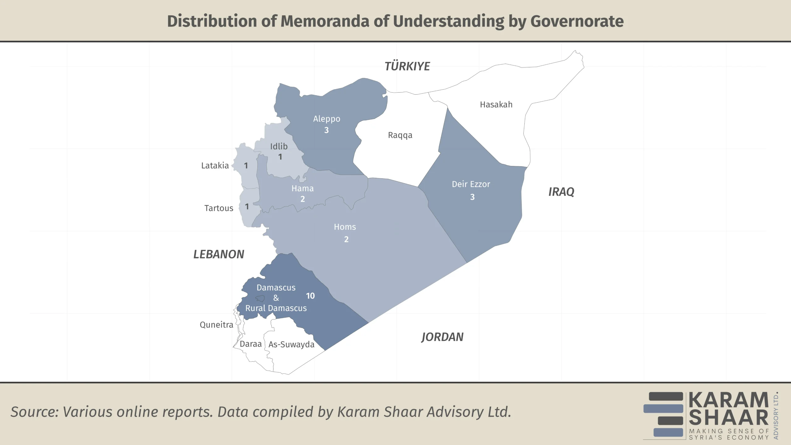 From a geographical perspective, the MoUs are spread across several provinces, with the primary concentration in Damascus and its countryside. Notably, Idlib Governorate—formerly the main stronghold of the current government—received only a single MoU. This could be read as a positive signal that the government does not intend to discriminate against previously contested areas, but it may also reflect a preference to keep Idlib’s future development more tightly under its own control, limiting external involvement at this stage.