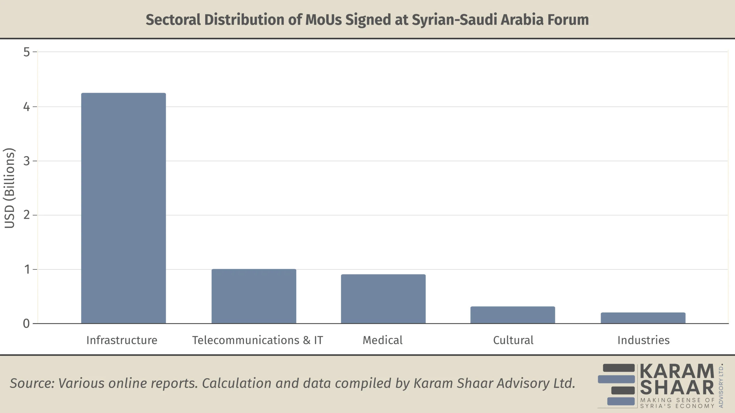 On 24 July 2025, the Syrian-Saudi Investment Forum was launched in Damascus with the participation of a high-level Saudi delegation headed by Minister of Investment Khalid Al-Falih. During the forum, 47 initial agreements and MoUs—were signed between several Syrian state institutions and Saudi companies, with a total value of USD 6.4 billion. Due to the inability to distinguish MoUs from these initial agreements according to the announcement, we treat all of them as MoUs.