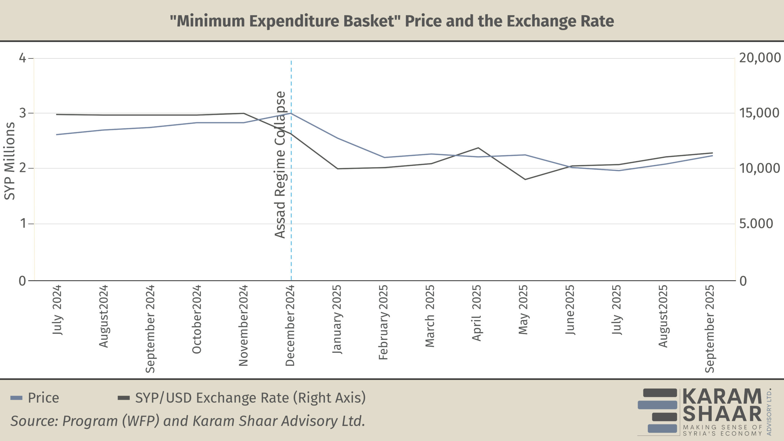 The combined effect of earlier declines in MEB costs and the June 2025 wage increases has modestly improved real purchasing power, though households remain severely constrained. By September 2025, the public-sector minimum wage of SYP 750,000 covered roughly 34 percent of the MEB, up from just 10 percent before the pay rise.