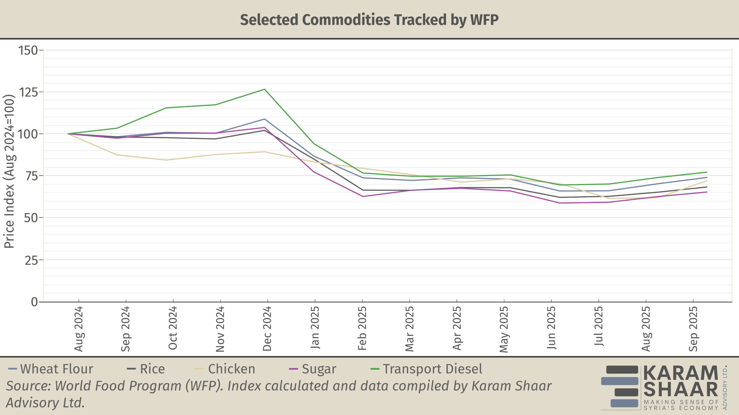 In the absence of official data, new estimates from the World Food Programme (WFP) offer a clearer view of recent price movements. WFP figures show that the Minimum Expenditure Basket (MEB)—a proxy for the average household’s cost of living—rose in August 2025, the first month-on-month increase since the start of the year, with signs the trend continued in September. After falling from 3.0 million SYP in December 2024 to 1.9 million SYP in July, the national MEB increased six percent to 2.0 million SYP in August and then seven percent to 2.2 million SYP in September. This pattern suggests the deflationary phase may have bottomed out. According to WFP, the increase was driven by higher prices for potatoes, vegetables, eggs, and vegetable oil, reflecting tighter seasonal supply amid widespread drought and a weaker exchange rate.