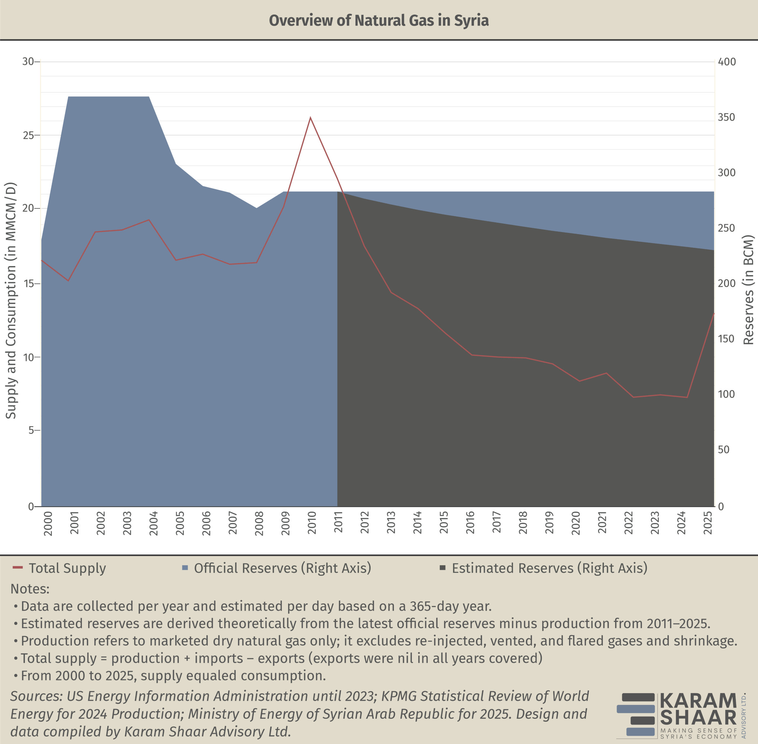 Before the conflict intensified in 2012, Syria’s gross natural gas production reached its historical peak at approximately 30 million cubic meters per day (MMCM/D) in 2011. At that time, about 9% of the gross production was flared, vented, or re-injected to maintain pressure in oil wells. By 2024, production had fallen sharply to around 7.4 MMCM/D, while fields under the control of the Syrian Democratic Forces (SDF) in northeast Syria produced roughly an additional 1 MMCM/D. Figures from 2023 indicate that more than half the total gas supply was used for electricity generation.