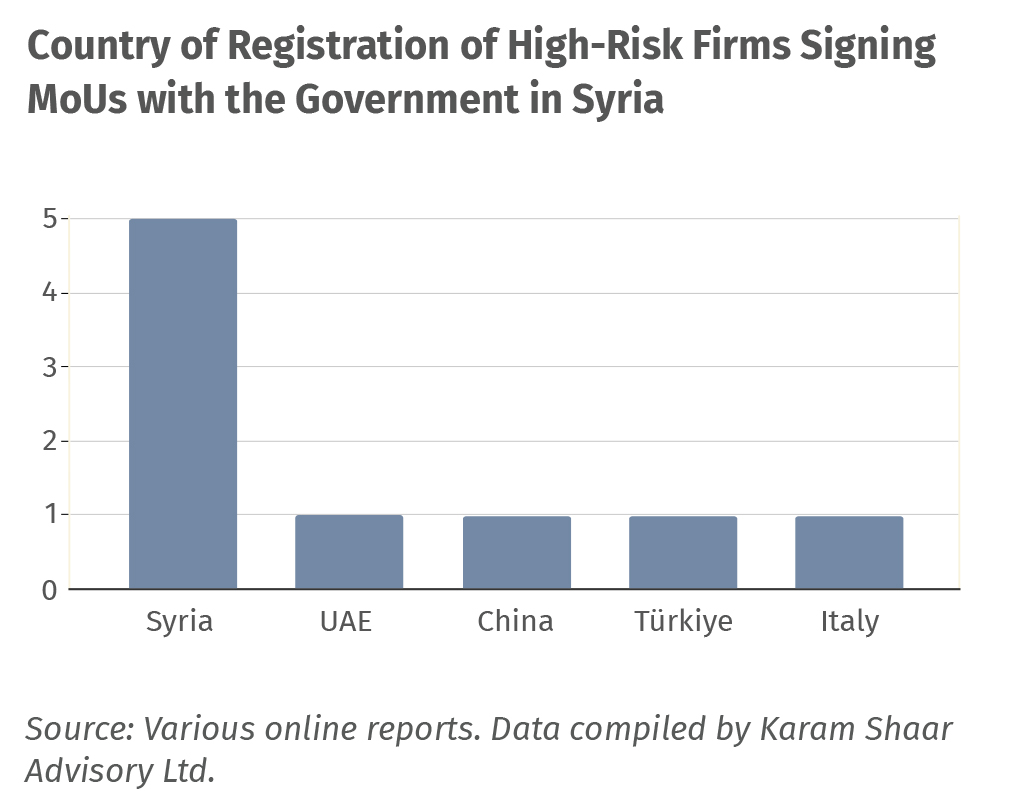 Building on that analysis, this article turns to the investors themselves. After documenting MoUs worth at least USD 25 billion, it has become critical to assess who these companies are and the operational and financial risks they pose. This article focuses on high-risk firms and how their involvement could affect the credibility of Syria’s reconstruction process.