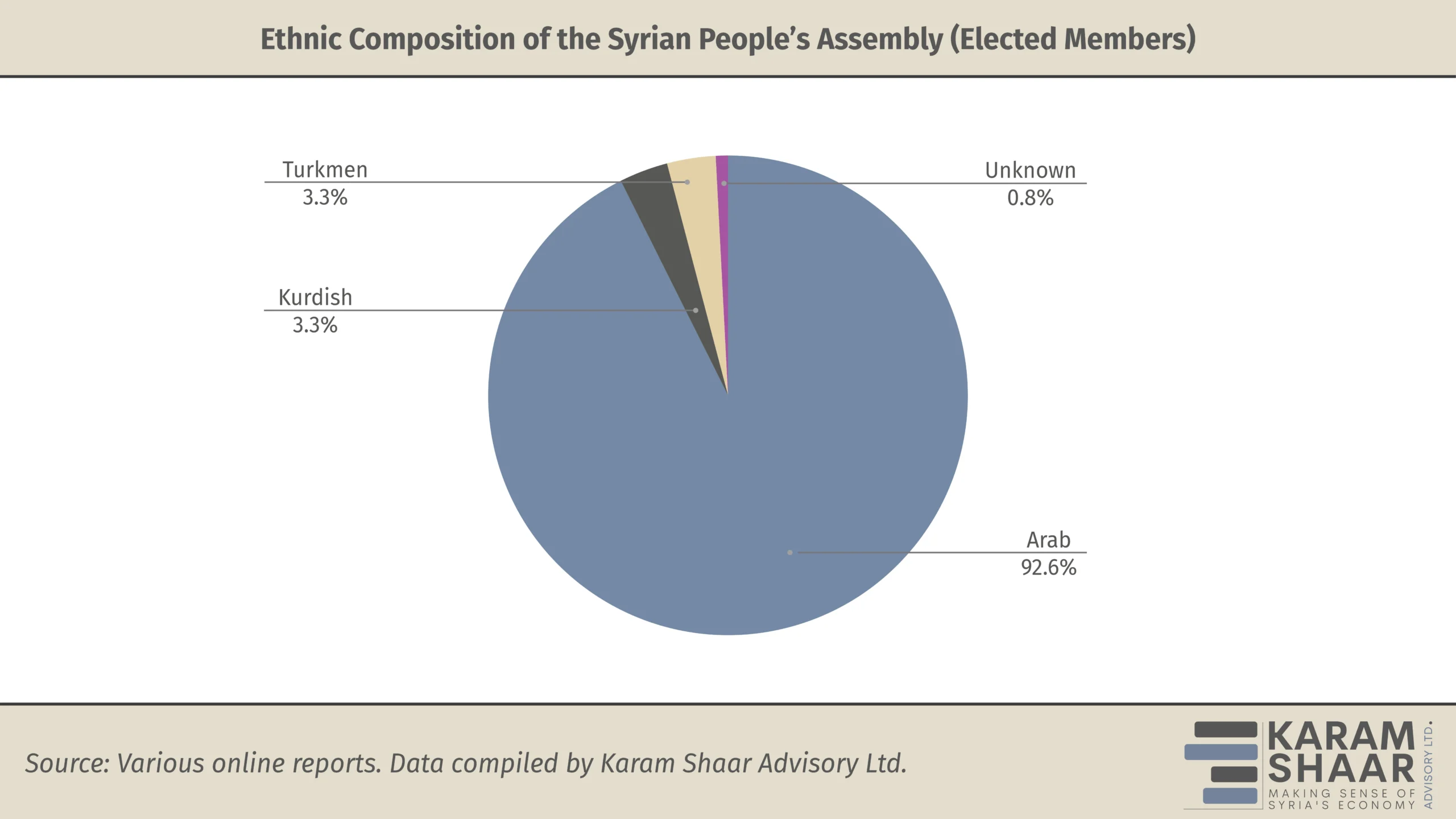 Ethnically, the Assembly is overwhelmingly Arab. Kurdish representation is limited to four members, all elected from Afrin, and does not reflect the community’s broader population base, particularly in Hasakah, where elections were not held. Smaller minorities, including Syriacs, Assyrians, and Circassians, are entirely absent.